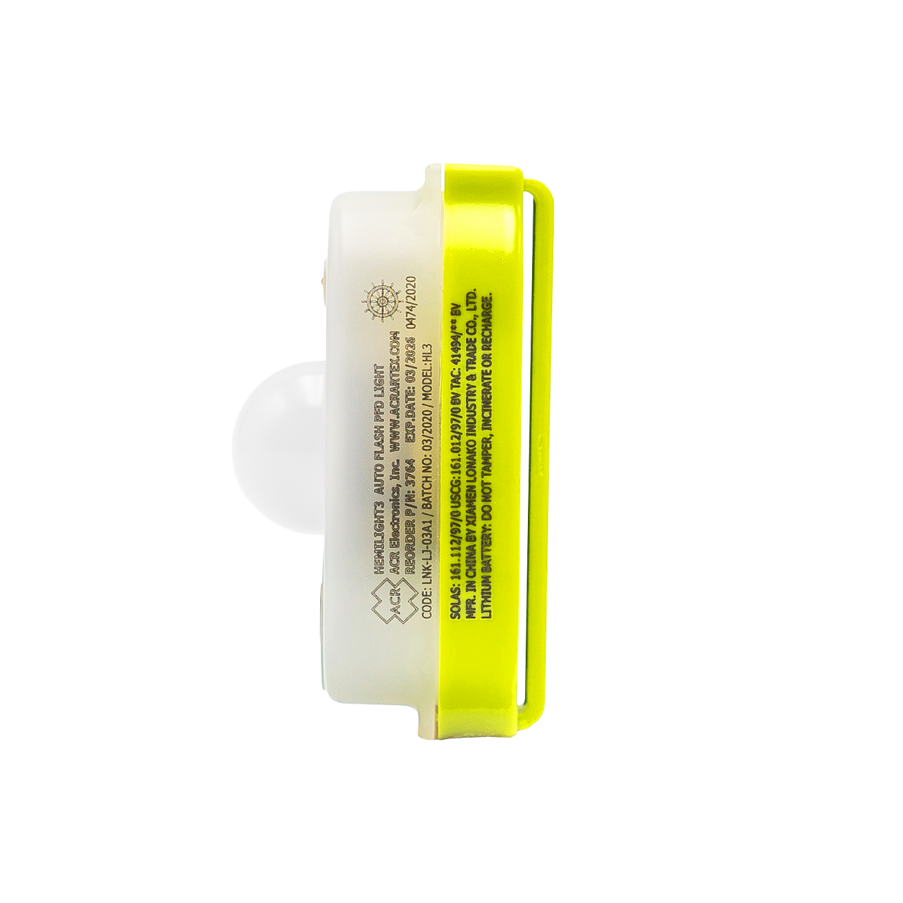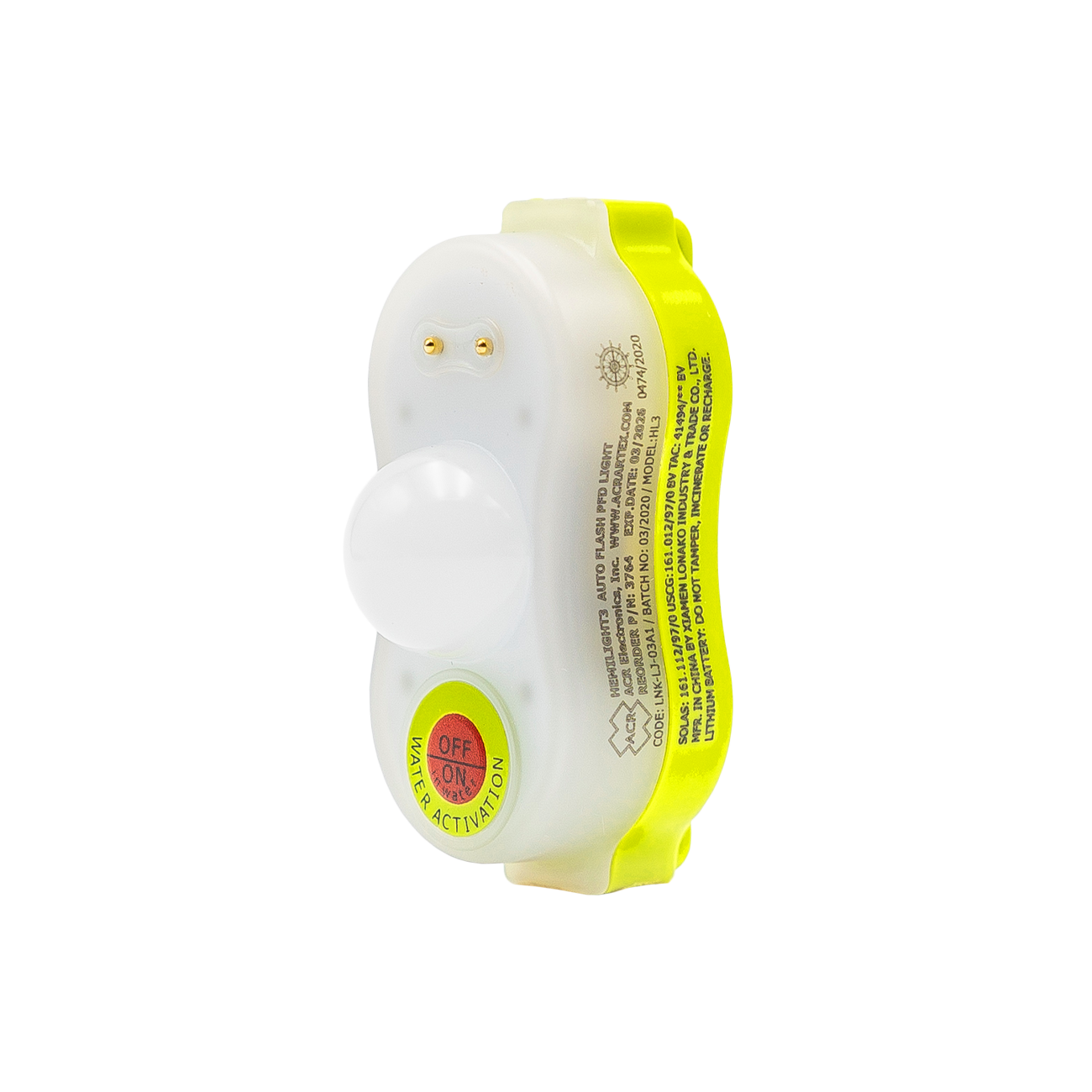 The ACR Auto HemiLight™3 flashing survival light attaches to almost any style life jacket with a quick and easy installation. Smaller than other approved lights, the HemiLight3 features rounded edges to maintain the integrity of inflatable life jackets and meets USCG, MED and SOLAS requirements. The high-intensity flashing LED light automatically activates for 20+ hours when it comes in contact with salt or fresh water, and can be deactivated simply by pushing the red button. Attachment loops accommodate up to 5 cm (2 in) wide webbing, and the marine-tough design ensures years of useful service.