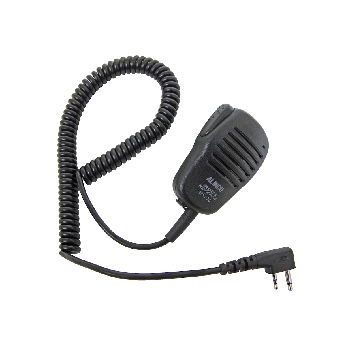 The Alinco EMS-76 speaker mic features a coiled cord and a flap-covered mini earphone jack at the base of the mic.