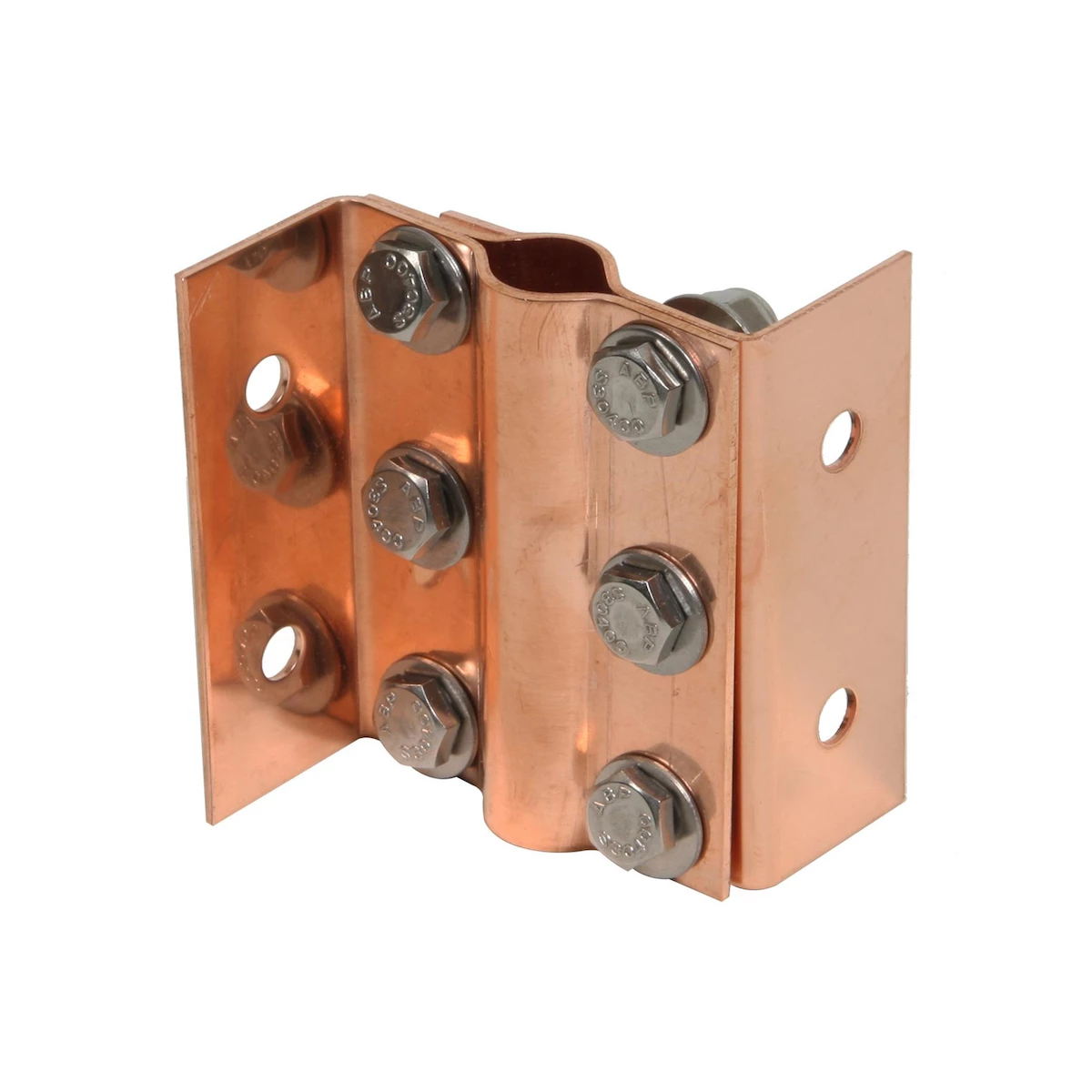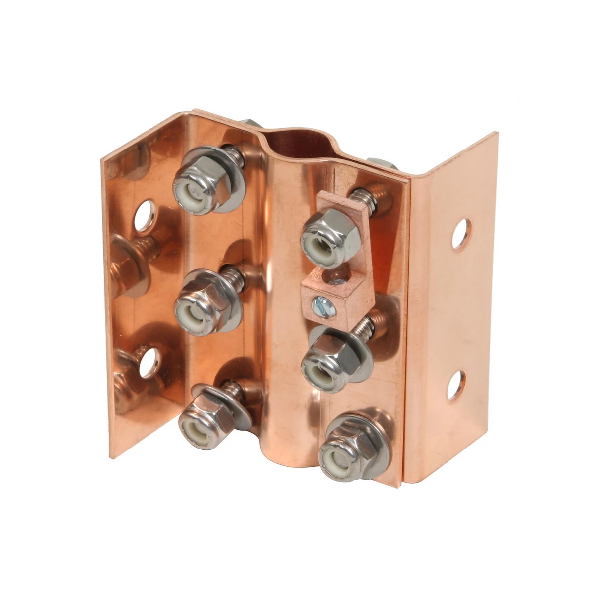 Alpha Delta UCGC Copper Ground Rod Clamps are uniquely formed to attach up to four Alpha Delta ATT or TT series surge protectors, or any stud type flange mount coaxial surge protectors, directly to a 5/8 or 3/4 in. copper ground rod. These clamps are made of solid copper and are provided with stainless steel hardware.
