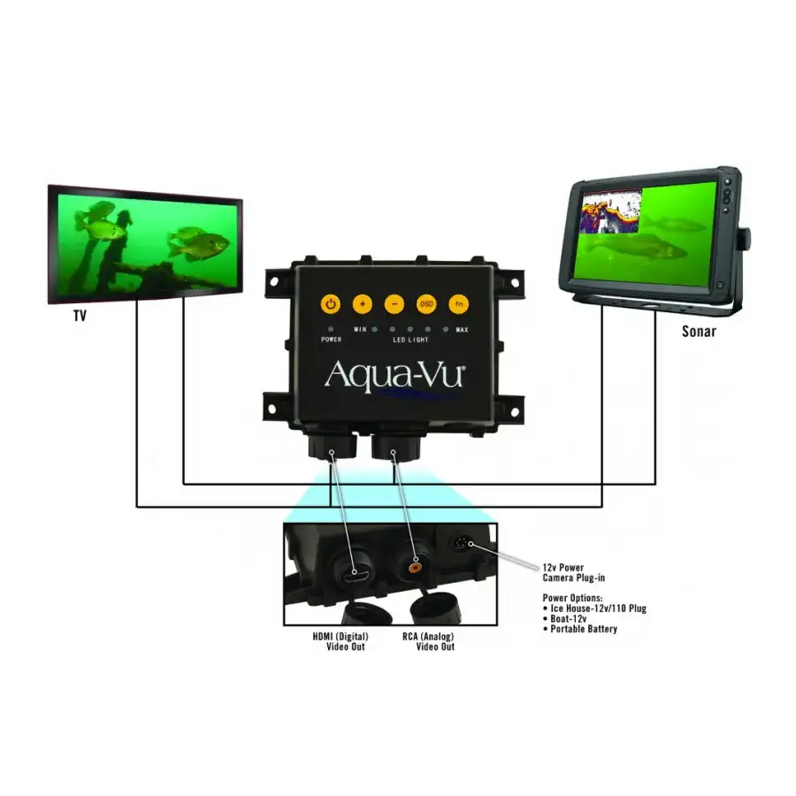 Add real time “live” viewing to any TV or HDMI-in enabled compatible sonar using an Aqua-VU Multi-Vu Pro Gen2 Underwater viewing system. The Aqua-Vu Multi-Vu Pro underwater camera system allows you to display an Aqua-Vu underwater camera on any screen, sonar, or TV, that accepts HDMI/RCA video input. Using an Aqua-Vu Mulit-Vu Pro will give you a “live” look underwater in real time. See what is happening, understand your electronics, and have more fun on the water!