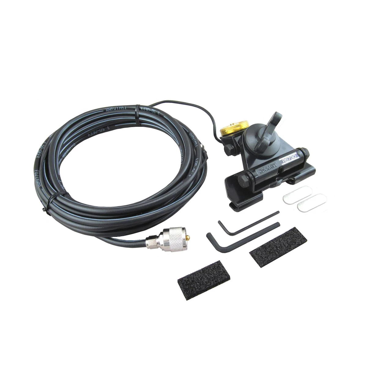 Universal adjustable lip mount, 16’6″ deluxe cable assembly with NMO/PL-259 connectors. Quality appearance and low loss coax cable assembly. Installs easily in only minutes to virtually any lip on a vehicle. Trunk lid, truck rear doors, SUV and van rear doors, hood lip, etc Does not damage expensive and/or leased vehicles. Footprint: 3.4″ x 1.25″