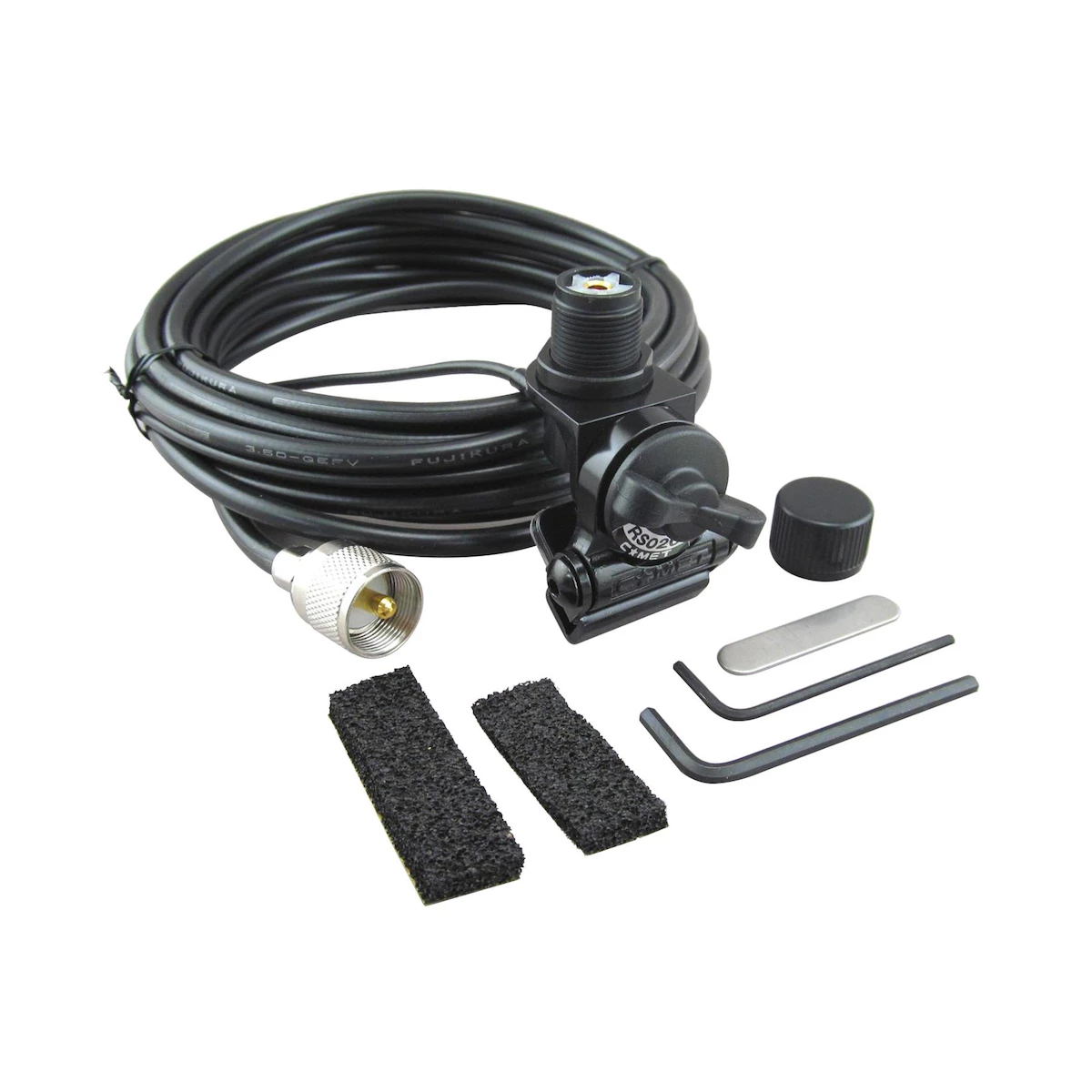 Quality appearance and quality materials: 16’9″ low loss deluxe coax cable assembly, the first 18″ being mini RG-174A/U type coax (1/8″ diameter) to get through the weather seal without damaging the coax, causing wind noise or creating water leaks. The balance of the coax is low loss, 24k gold plated SO-239 and PL-259 connectors. The PL-259 connector disassembles for easier routing through small holes, under the carpet, etc…or to shorten the coax length.