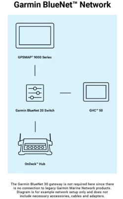 Increase the number of available network ports in a Garmin BlueNet network. Once you’ve used all the ports on your compatible chartplotter just add a Garmin BlueNet 20 switch to the setup and keep constructing your expansive high-speed network.