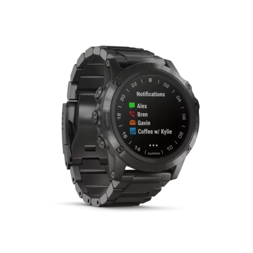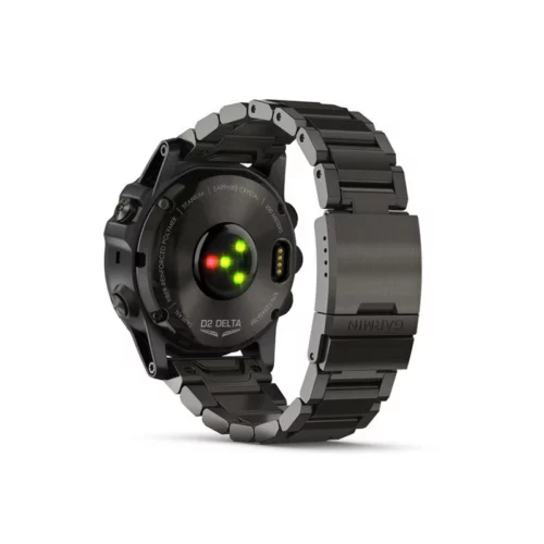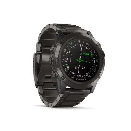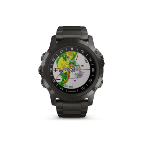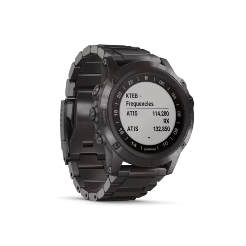 Featuring a full-sized (51 mm) form factor with an elegant titanium gray diamond-like carbon (DLC) finished bezel and bracelet-style watch band plus scratch-resistant domed sapphire crystal lens, the D2 Delta PX model is our most evolved, most sophisticated aviation wearable to date. Built for extra-rugged durability in demanding environments, it’s a true GPS-based flight system that you can count on to provide reliable situational reference and backup navigation in your cockpit. What’s more, it’s our first D2 series watch to offer a wrist-based Pulse Ox sensor¹ for blood oxygen saturation awareness. Then, between flights, you can use the latest sport watch features — including Elevate™ wrist-based heart rate monitoring¹, daily activity tracking², training metrics and more — to keep up with your personal fitness goals. For these intense activities, each D2 Delta version comes with a soft, flexible black silicone sports band, offering easy Garmin QuickFit watch band replacement without tools. And wherever you travel, smart notifications¹ (emails, text messages, alerts and more) can display on the watch to help you stay in the know while on the go.