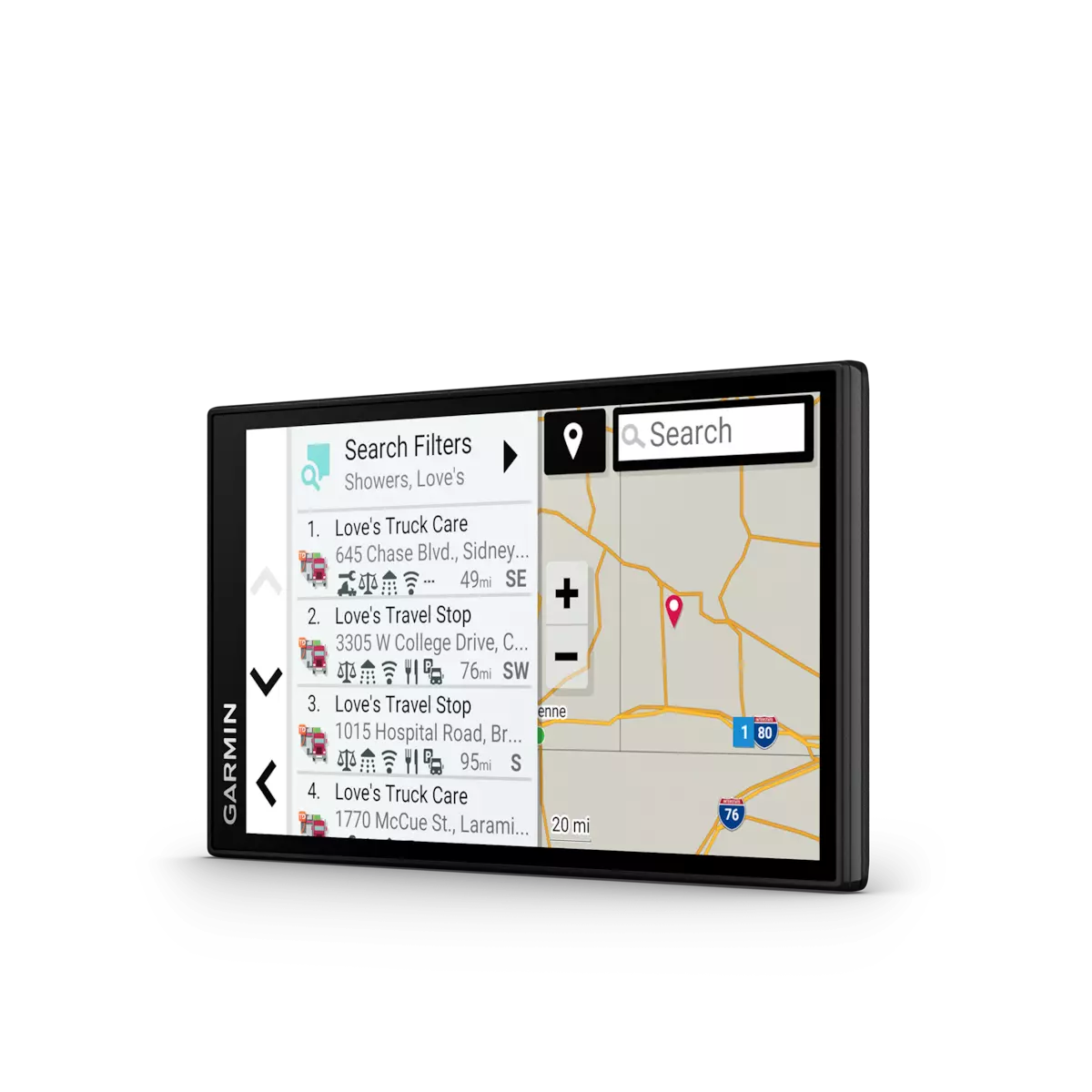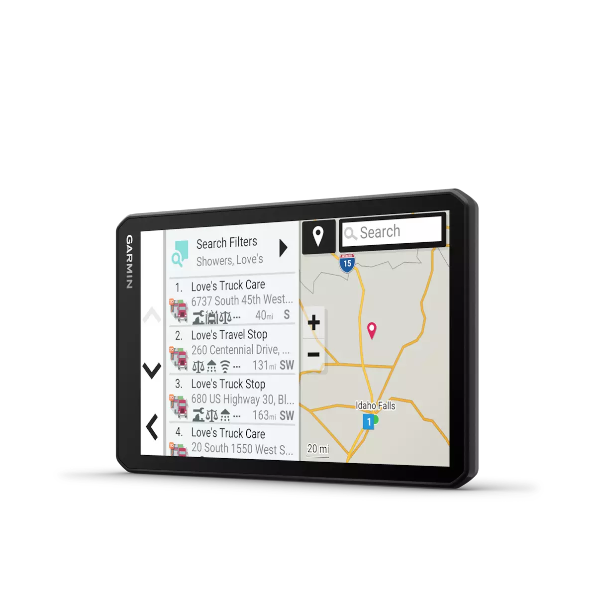 A rich directory of Truck & Trailer Services allows drivers to filter truck stops by preferred brand or amenity, i.e., “Love’s” or “Showers.”