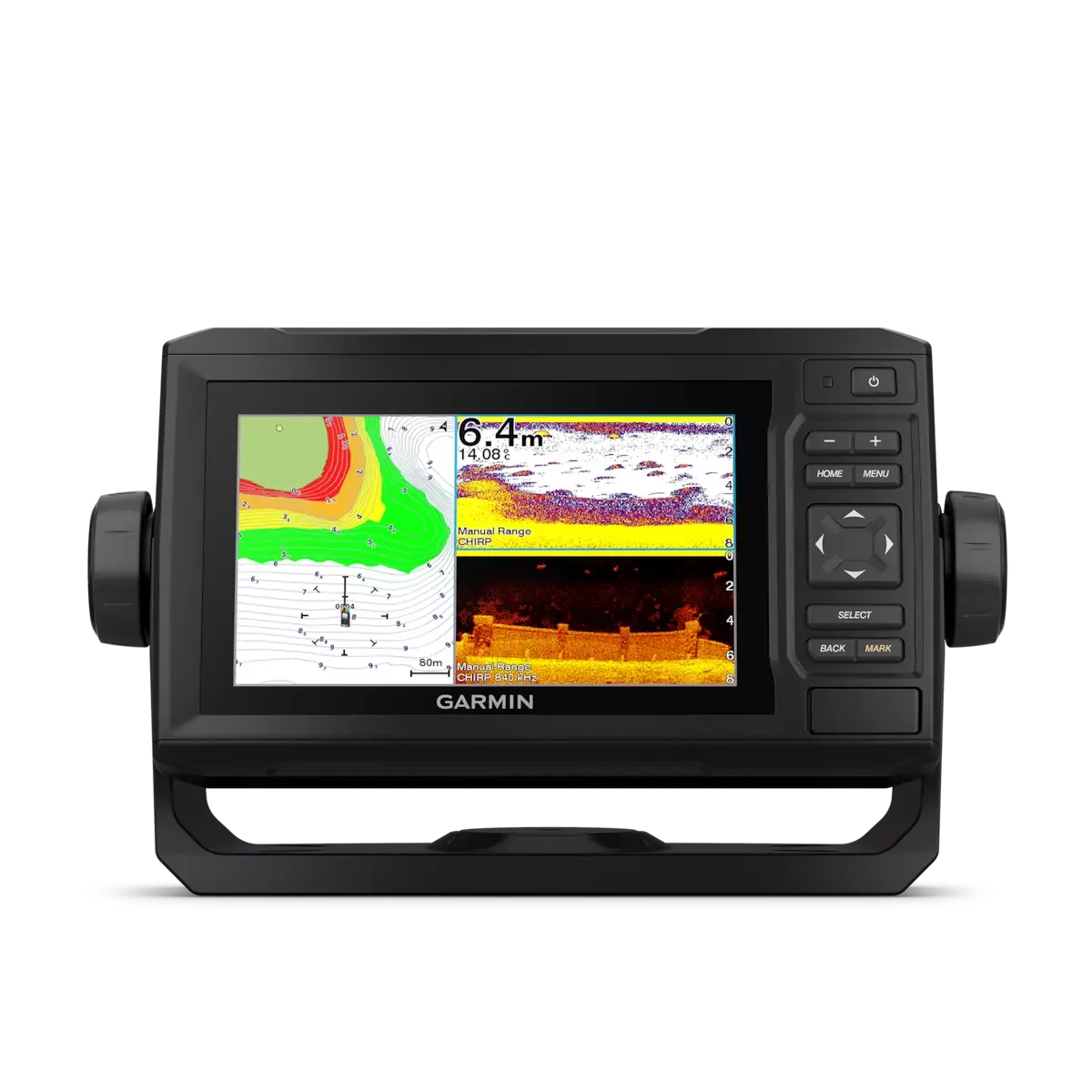 The sunlight-readable 6” touchscreen chartplotter features a quick-release bail mount, and the transducer bundle adds Ultra High-Definition scanning sonar and CHIRP traditional sonar.