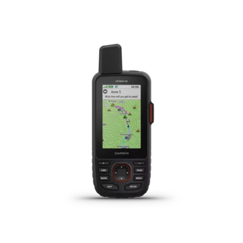 The sturdy, button-operated GPSMAP 66i features a large 3″ colour display you can see even in bright sunlight. If you’re out in the field for long stretches of time, you can turn on Expedition mode and get up to 200 hours of battery life while using inReach technology. In the default tracking mode, you get up to 35 hours of battery life, and your device will save your location every 10 minutes.