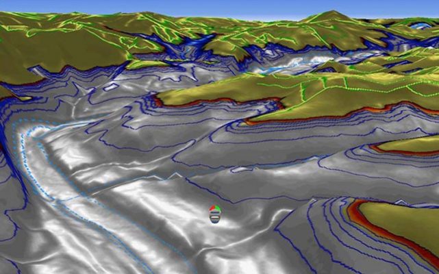 This underwater perspective shows 3-D representation of lake bottom and contours as seen from below the waterline. Interface with sonar data for a customized view.