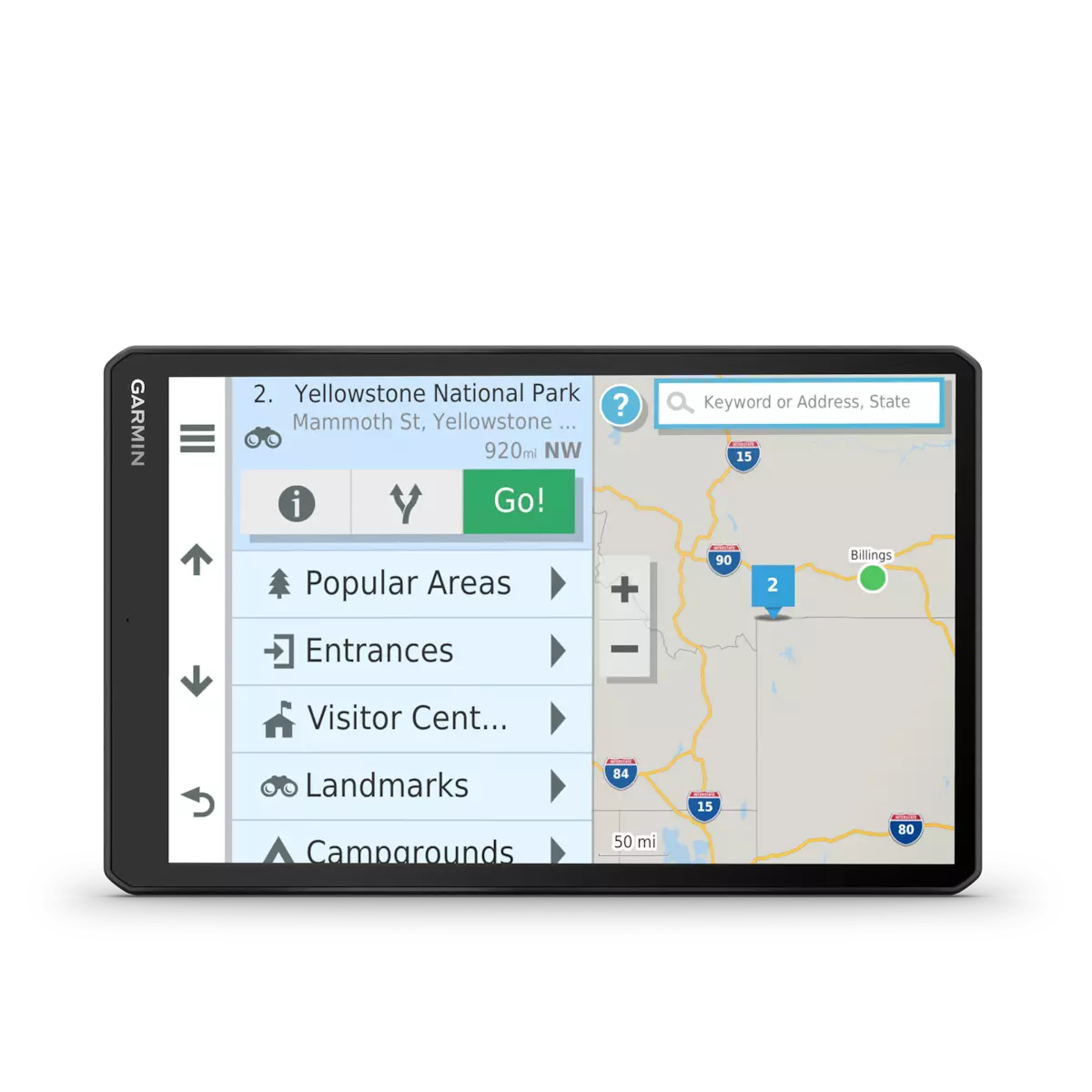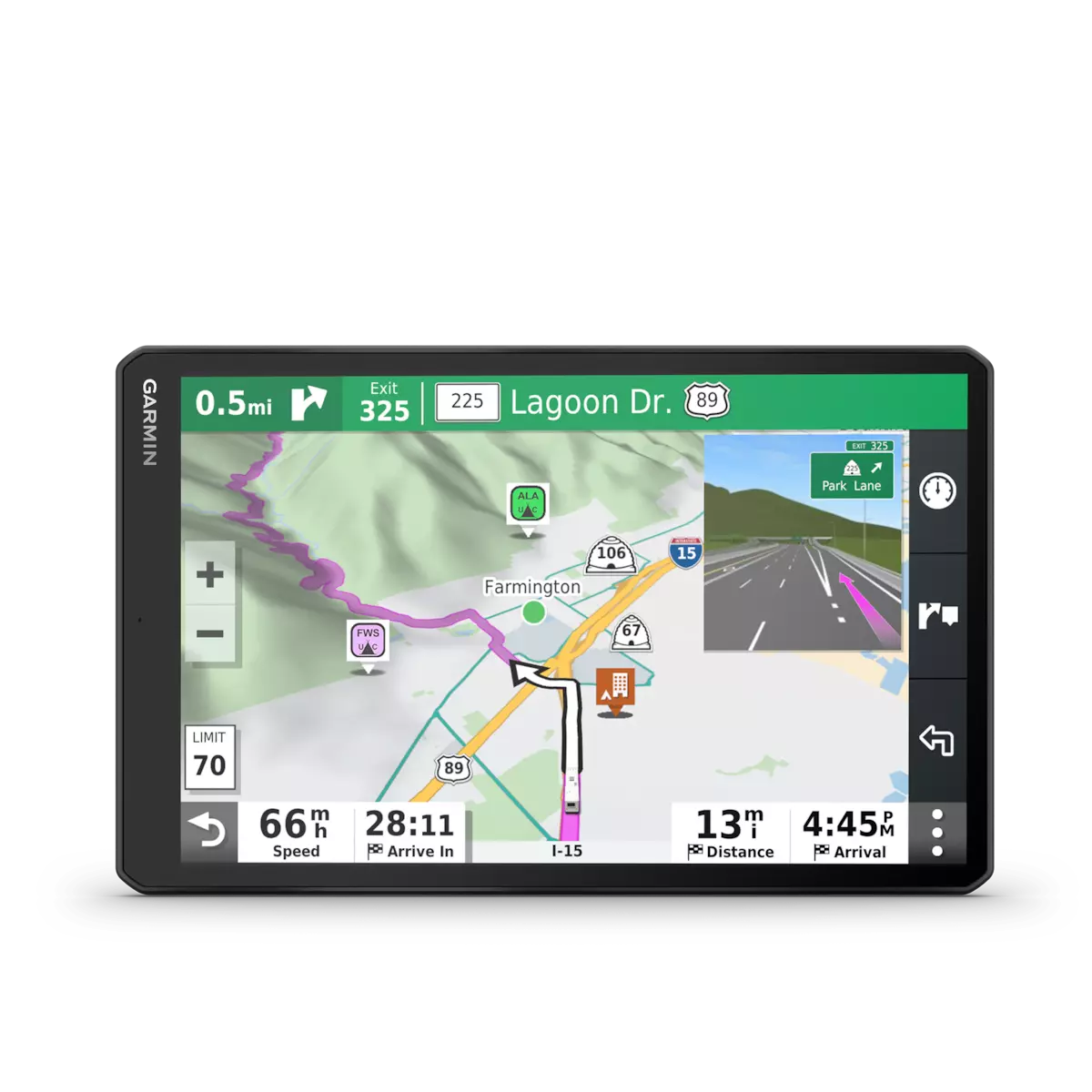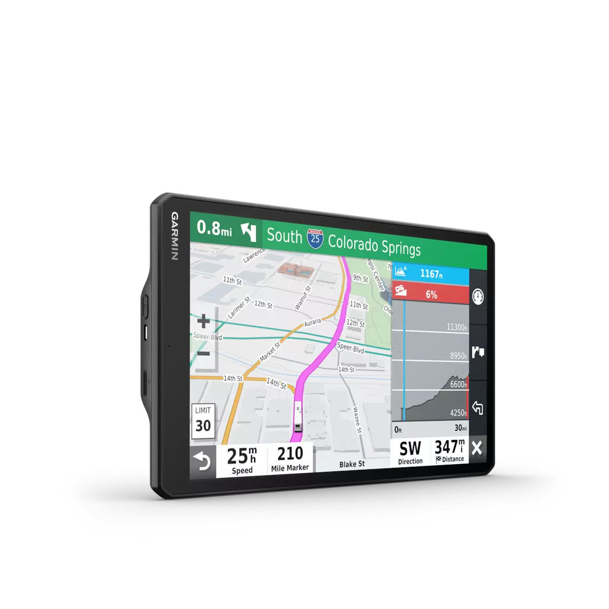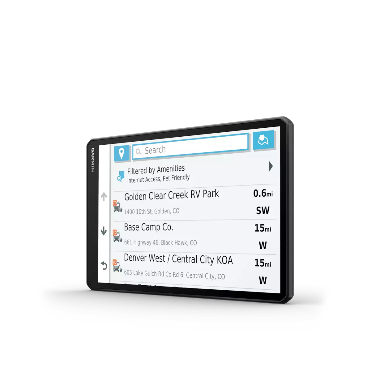 RV 1090 creates custom routes to suit the size and weight of your RV¹ and provides road warnings for steep grades, sharp curves and more on the large, 10” display.