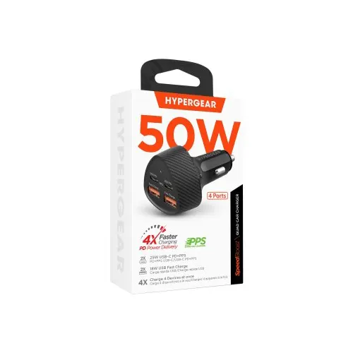 The HyperGear SpeedBoost 50W Dual USB-C & Dual USB-A CLA Fast Charge Car Charger guarantees super-fast charging for two phones, two tablets, or up to four devices and accessories at the same time. Enhanced with the most cutting-edge charging technologies, both 25W USB-C PD ports each provide more than 4X the power of your car’s built-in USB port, bringing the latest iPhone and Android phones from 0 to 50% in UNDER 30 minutes. And with Programmable Power Supply (PPS) support for compatible phones, the charger can make micro-adjustments throughout the entire charging cycle that boost its energy efficiency while also protecting your battery from harmful heat buildup. Plug all of your power-hungry devices into the SpeedBoost 50W Quad Car Charger and always arrive fully charged!