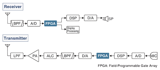 The IC-7300 employs an RF direct sampling system, where RF signals are directly convert to digital data. Then processed in the FPGA (Field-Programmable Gate Array), making it possible to simplify the circuit construction as well as reduce noise that can mask weak signals.