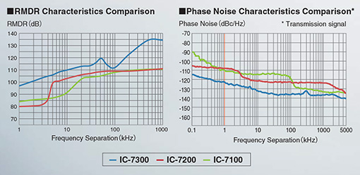 The IC-7300’s RMDR is about 97dB* (typical value) improving the Phase Noise characteristics by about 15dB (at 1 kHz frequency separation). The superior Phase Noise characteristics reduce noise components for both receive and transmit signals.