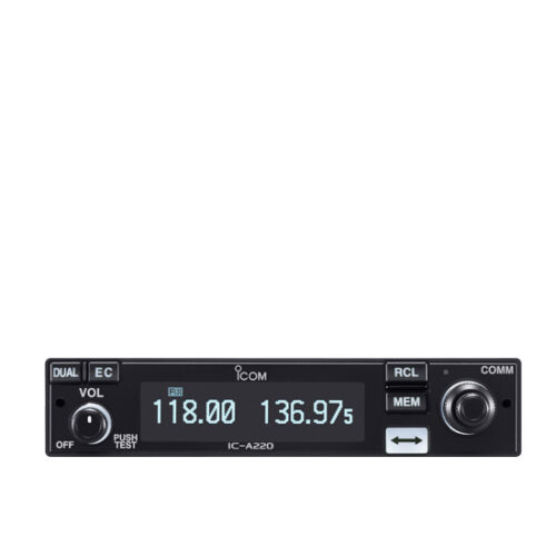 The IC-A220 has a bright organic light emitting diode (OLED) display with a wide 170-degree viewing angle. White characters on a black background give the viewer clear, easy to read operating information. The white key backlighting and white OLED display match a modern plane’s instrument panel. In addition, the auto dimmer function adjusts the display for optimum brightness for either day or night.