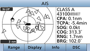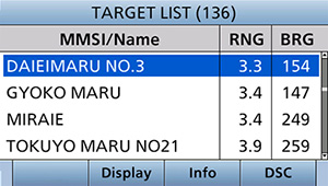 The M605 with the integrated AIS receiver can show AIS vessel traffic information on the display. The AIS combo screen enables you to monitor the AIS plotter during basic operation. The M605 also allows the user to directly call a selected AIS target from the AIS screen using an individual DSC all.