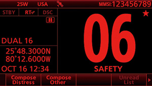 Bring on the color. The M605’s large 4.3” color TFT LCD display provides nearly a 180 degree viewing angle. The high resolution characters and function icons along with the directional keypad and soft keys provide an intuitive user interface. The night mode screen provides comfortable operation in the dark. Most used functions are assigned to soft keys (at the bottom of the display) for quick one push function access. The large ten-key pad enables users to smoothly enter channel numbers, MMSI numbers with ID names and much more.
