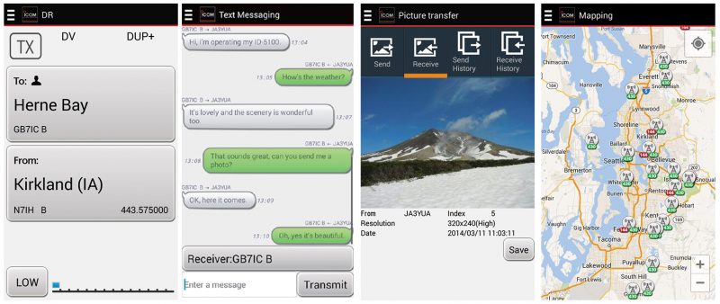Install the UT-137 Bluetooth® board and download the RS-MS1I (for iOS™ devices) or RS-MS1A (for Android™ devices) to enable you to wirelessly connect to the ID-4100A and remotely set the DR functions, link with a map application, and send/receive messages over the DV mode. In addition, pictures taken by a smart device can be transmitted via the DV Fast Data mode or DV mode.