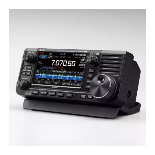 Desktop Holder for IC-705 makes the portable transceiver steady and positioned upward for easy viewing and operation.