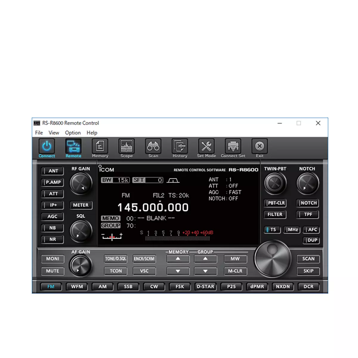 The Icom RS-R8600 IP Remote Control Software allows you to use an Icom compatible radio installed in another room using your home network or even from a remote location over the Internet. Most functions and modes of your IC-R8600 can be controlled.