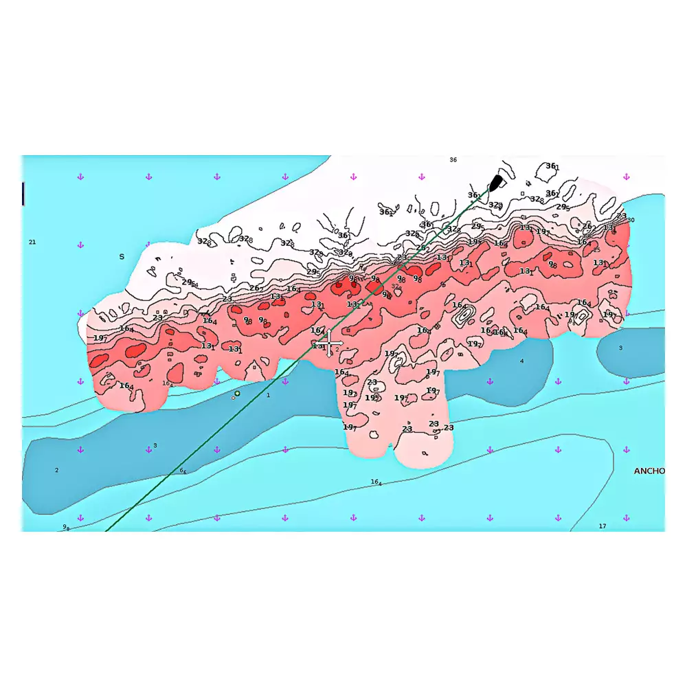 For improved fishing and navigation, SonarChart HD bathymetry maps display up to 1’ (0.5 meter) contours, providing a more detailed depiction of bottom structure