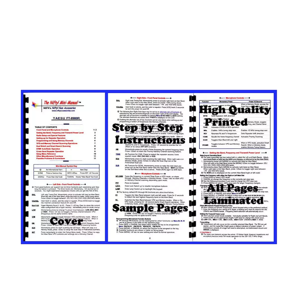 Compact FT-8900R Mini-Manual. Size, 4.5×8 inches. Twelve high-quality laminated pages, loaded with detailed instructions. An ideal short-form instruction manual for operating this quad band FM transceiver.