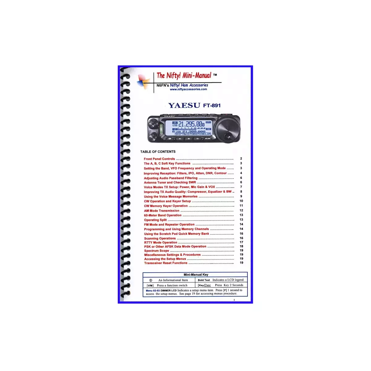 Compact FT-891 Mini-Manual. Size, 4.5×8 inches. Twenty high-quality laminated pages, loaded with detailed instructions for all operations. An ideal short-form guide for setting-up and operating all the capabilities of this compact HF+50Mhz all-mode radio, including how to use DSP filters, DNF, DNR, IF/Shift, Contour and Audio Bandpass Filtering to optimize reception.