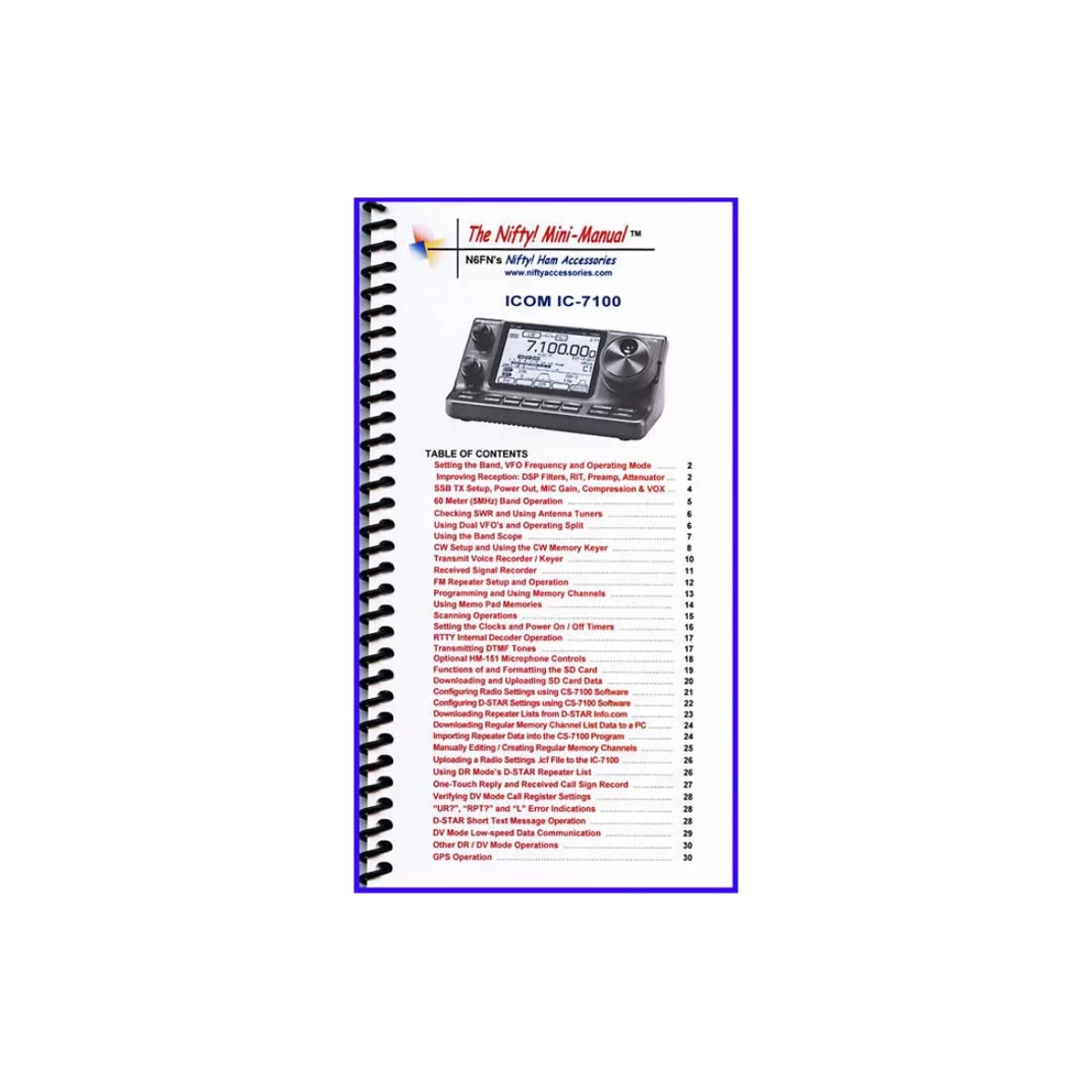 Compact IC-7100 Mini-Manual. Comprehensive operating guide for the IC-7100. Size, 4.5×8 inches. Thirty-two high-quality laminated pages, loaded with detailed instructions covering all aspects of operation. In addition to all HF and VHF/UHF features the guide covers using the SD memory, D-STAR repeater downloads and operation, GPS functions and the CS-7100 cloning software.
