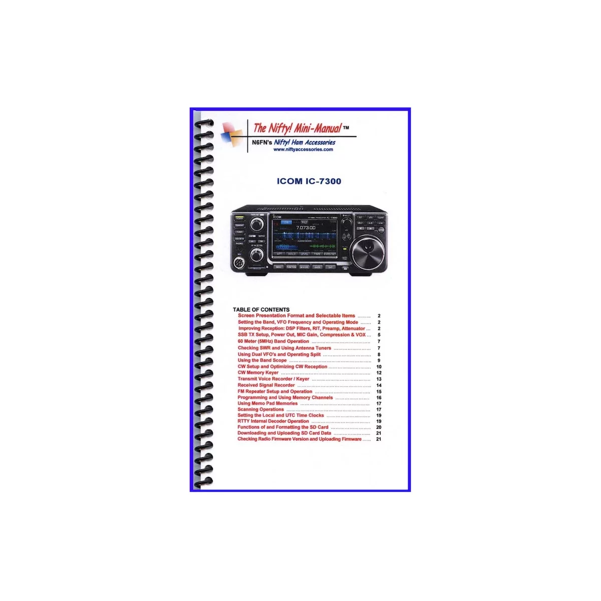 Compact IC-7300 Mini-Manual. Comprehensive operating guide for the IC-7300. Size, 4.5×8 inches. Twenty-four high-quality laminated pages, loaded with detailed instructions. Ideal for setting-up and operating this innovative RF direct sampling transceiver. Instructions for setting up DSP filtering and RX and TX signal processing for great sounding audio; using the waterfall and audio scope functions, as well as all other menus and modes of operation.