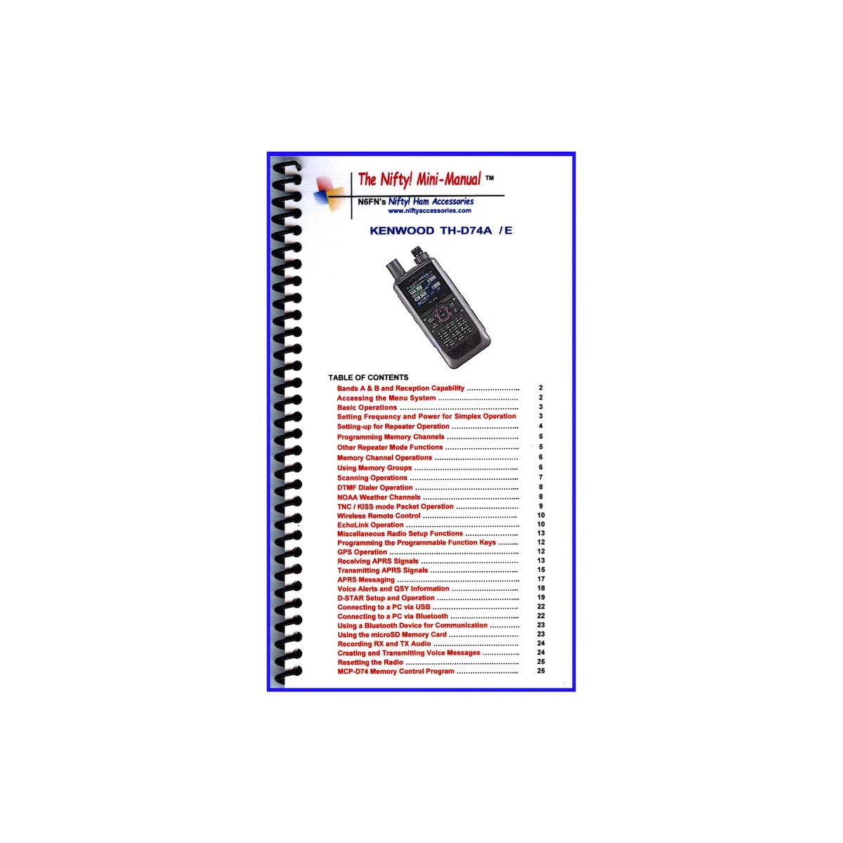 Compact TH-D74A / TH-D74E Mini-Manual operating guide. Size, 4.5×8 inches. Twenty-six high-quality laminated pages, loaded with detailed instructions for all operations.