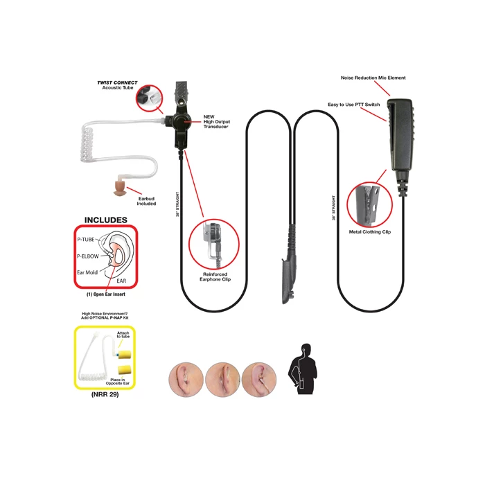 The SPM-2363 is a 2-wire style surveillance kit with a clear acoustic tube earphone. The SPM-2363 features a lapel-style microphone with a stealth clothing clip that can either be secured to the user’s clothes or dropped down a shirt sleeve. The earphone features PRYME’s TWIST CONNECT locking mechanism, which makes it easy to replace or remove the earphone.