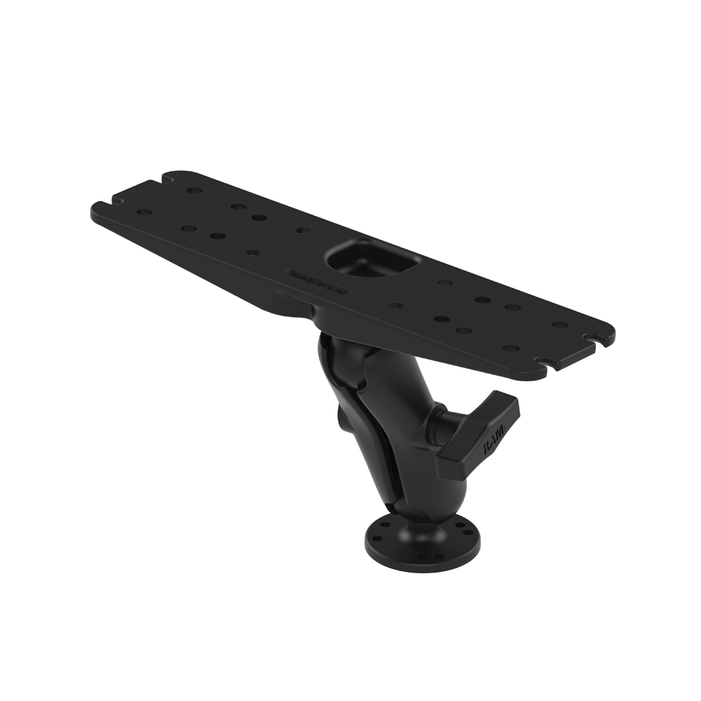 The RAM-137U, powder coated marine grade aluminum mount, consists of a double socket arm mount (RAM-201U), one 2.5″ diameter round base (RAM-202U) with 1.5″ rubber ball and flat 11″ x 3″ rectangular plate (RAM-137BU). The plate contains different combinations of pre-drilled holes which will match up to many electronic devices and mounts, including Marine GPS, CB Radios, Ham Radios, Gimbal Brackets and more. Rubber ball, socket technology dampens shock and vibration, as well as allows for almost infinite adjustment, perfect viewing angles.