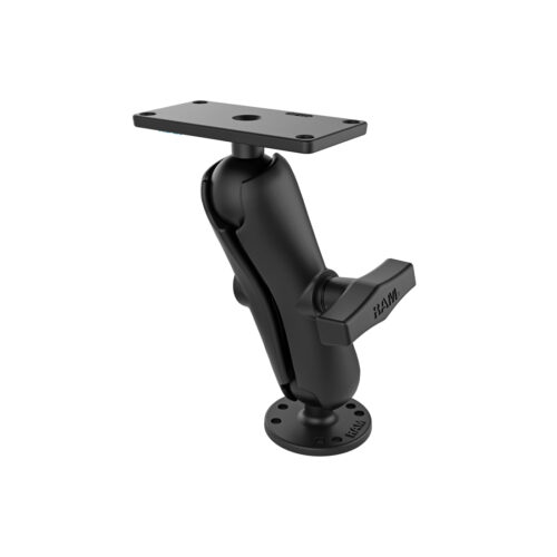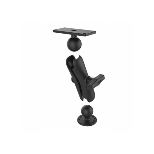 The RAM-202-24-202U, powder coated marine grade aluminum mount, consists of a double socket arm mount, one round 2.5″ diameter round base with the universal AMPS hole pattern and one 2″ x 4″ rectangular base. The unique rubber ball and socket technology dampens shock and vibration while offering high adjustibility to achieve the perfect viewing angle.
