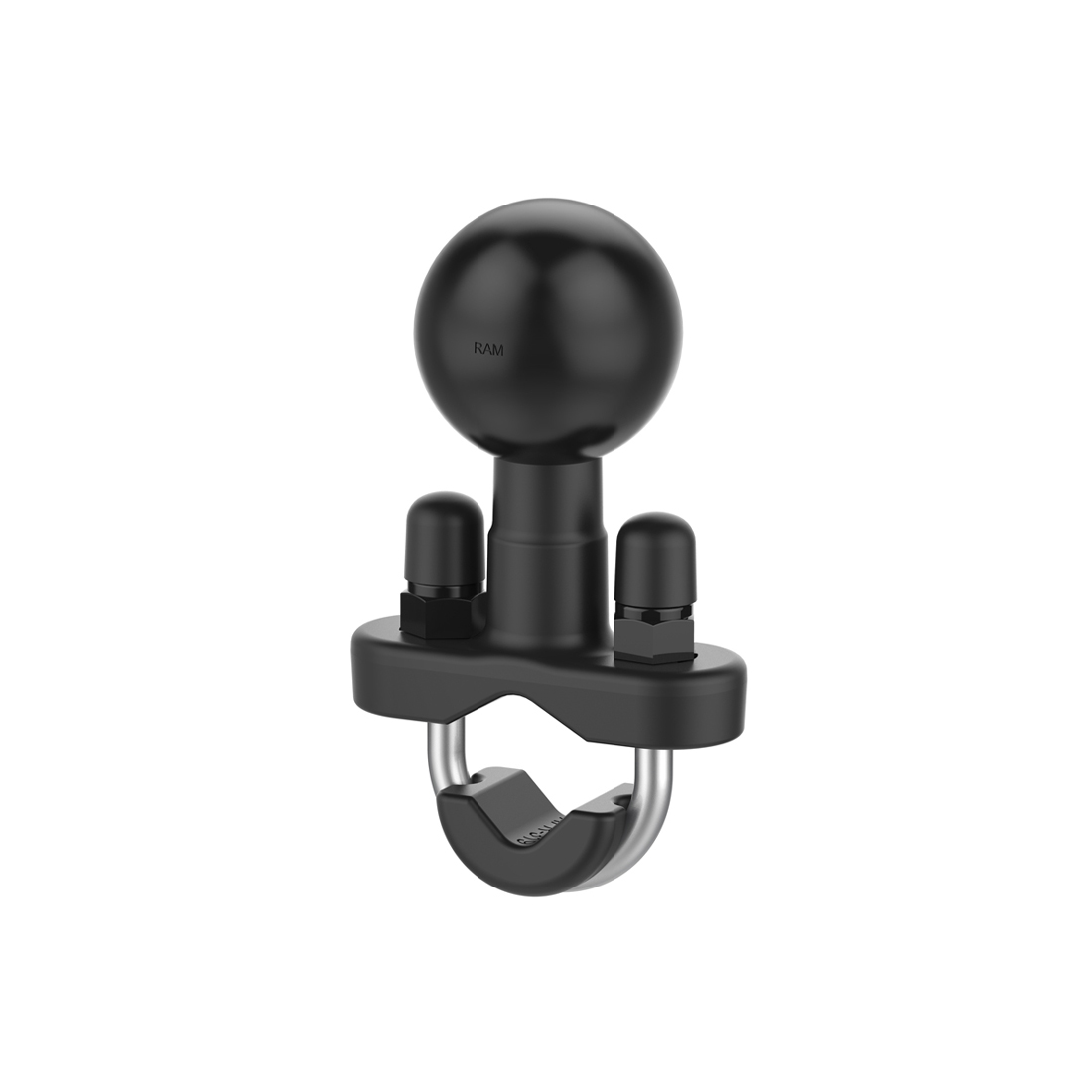 The RAM motorcycle handlebar base contains a 1.5″ rubber ball designed to sit at right angles to the mounting rail. The “Rust-Proof” stainless steel u-bolt accommodates rails in diameter from 0.5″ to 1″ in diameter. Included are black cover caps to be placed over the exposed ends of the u-bolt and a composite adapter that can narrow the rail to a minimum width of 0.5″.