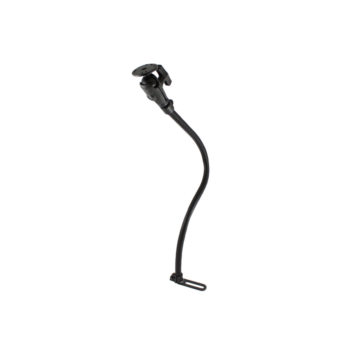 At right angles to the base of the flexible 30″ long leg is a foot with a mounting hole. Simply place the hole into the passenger seat mounting bolt and adjust the mount to the required height with the flexible leg. The rigid flexible arm will hold everything you need safely and securely.