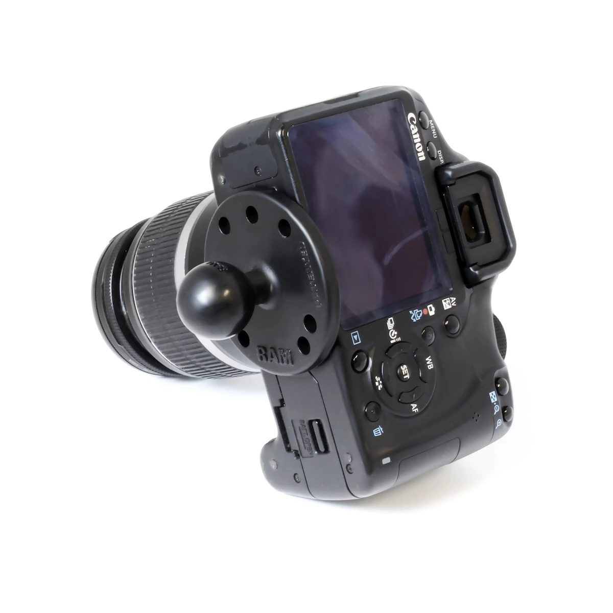 The RAM-B-202AU, universal camera and camcorder base, consists of a 1″ diameter rubber ball, connected to a 2.5″ diameter round plate with 1/4″-20 camera thread. The round plate provides extra support and stability for cameras that rest on top of it. The male 1/4″-20 threaded steel stud will connect to any standard female thread found on camcorders and digital cameras.