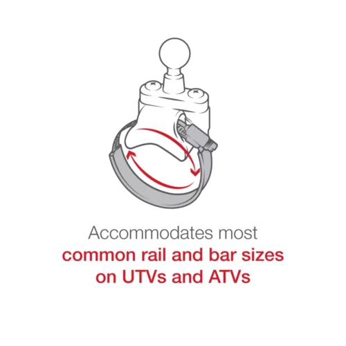 The RAM-B-231-2 consists of a 1″ diameter rubber ball connected at right angles to a base that contains a flexible metal strap. The strap base tightening screw is encased in a compact housing for a clean, safe finish. The strap is long enough to wrap around handle bar posts found on most ATV, UTV, Snowmobiles, Motorcycles and any other applications you can think of.