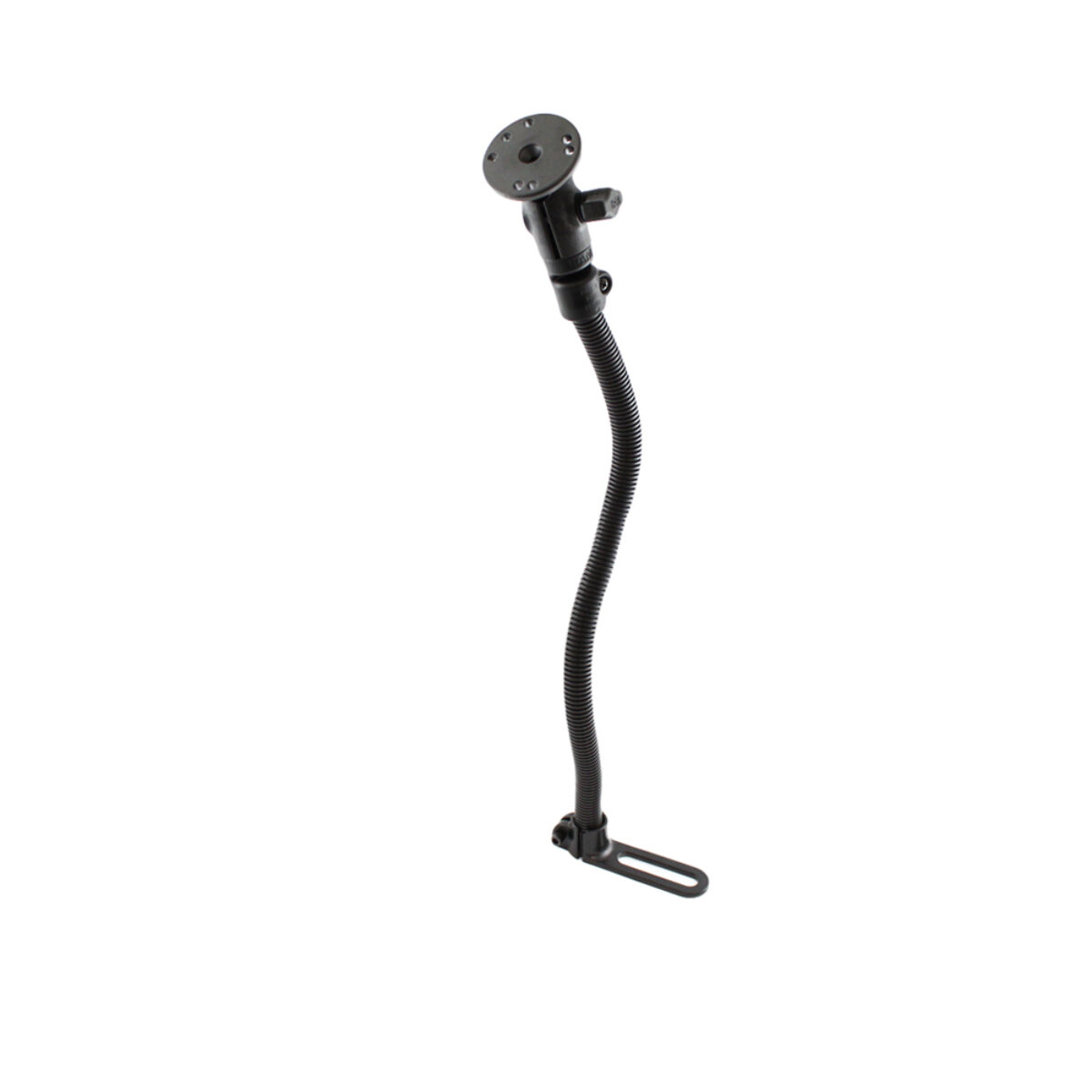 The RAM-B-316-1-202U consists of the RAM POD I universal No-Drill™ vehicle base, 18” rigid aluminum rod, single B Size 1″ ball socket arm and round base plate. The base of the mount connects to your seat rail without any drilling necessary. The 18″ rigid aluminum rod can be bent to position your device to its optimum viewing location. The 2.5″ diameter round base adapter contains the universal AMPS hole pattern.
