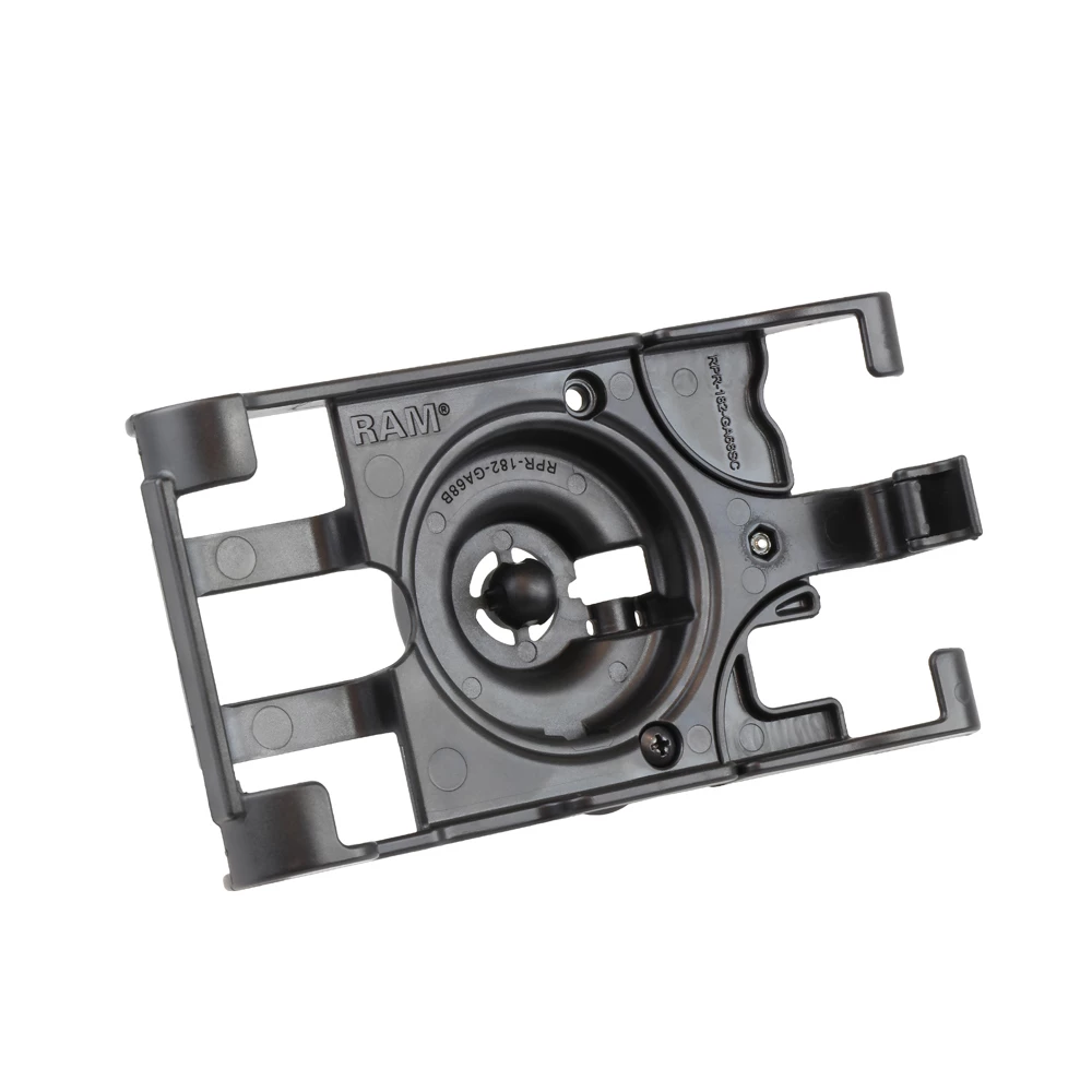 The cradle allows for full range of motion of the device camera and integrates the factory Garmin magnetic dock for access to charging. The high-strength composite mount integrates a cable retention system to prevent accidental unplugging. The custom-fit cradle also has a locking option that is installed using press-fit nuts to enhance security. The cradle has two location options to attach the RAM ball (comes with 1″ B-Size ball).