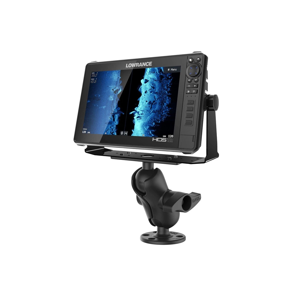 The RAM-D-115-C consists of a base (RAM-D-202U) with a 2.25” diameter D size ball, a short arm (RAM-D-201U-C) and a 6.25” x 2” marine electronic (RAM-D-115BU) plate with a D size ball for supporting larger devices. This marine electronic plate contains different combinations of pre-drilled holes and is a direct fit for 9”-12” fishfinder gimbal brackets. Supports devices such as the Lowrance HDS-9 Gen2 Touch, Garmin GPSMAP 7407 and more.