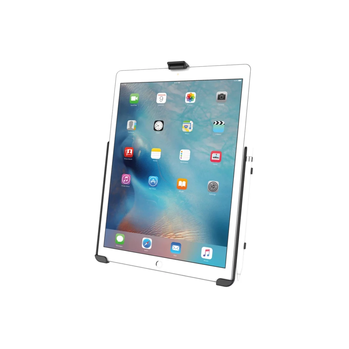 The RAM® Mounts EZ-Roll’r™ cradle for the iPad Pro secures your device in a form-fit holder that keeps the entire screen visible. Designed for tablets that are not in a case, the EZ-Roll’r for the iPad Pro features a holder for the Apple Pencil as well. Simply slide the tablet into the bottom cups and then roll the top clip over the top of the device to anchor it into the cradle. Side buttons, charging port and camera lens are conveniently exposed and accessible while in the EZ-Roll’r™ cradle.