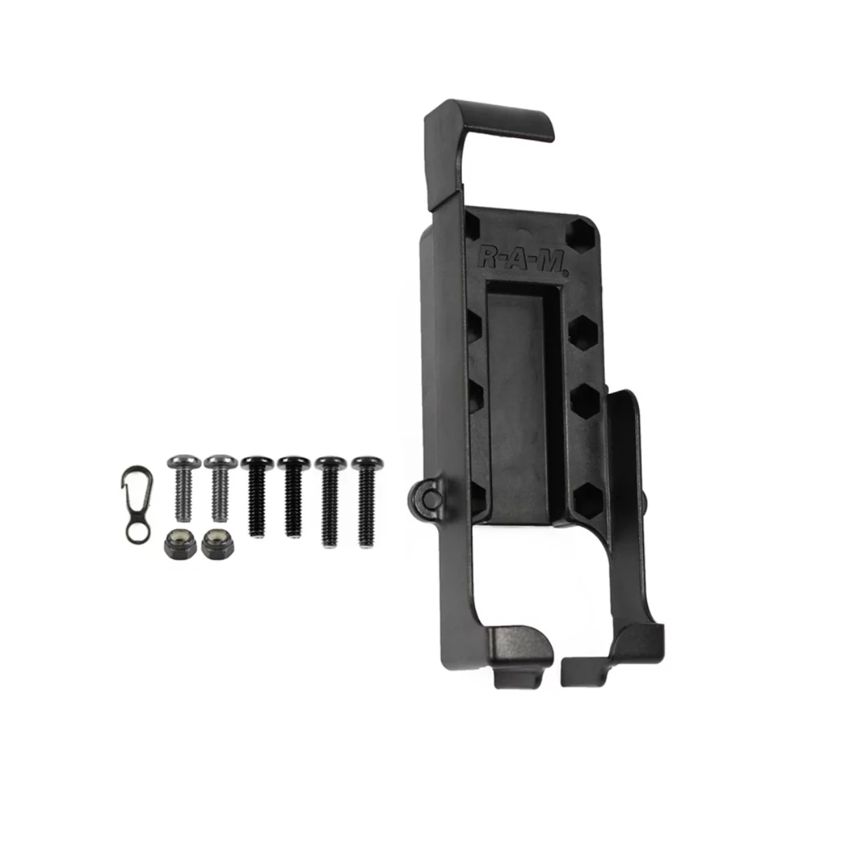All cables can stay connected to the unit while in the RAM cradle. The cradle includes a set of two nuts and bolts to connect the cradle to any of the RAM compatible mounts.