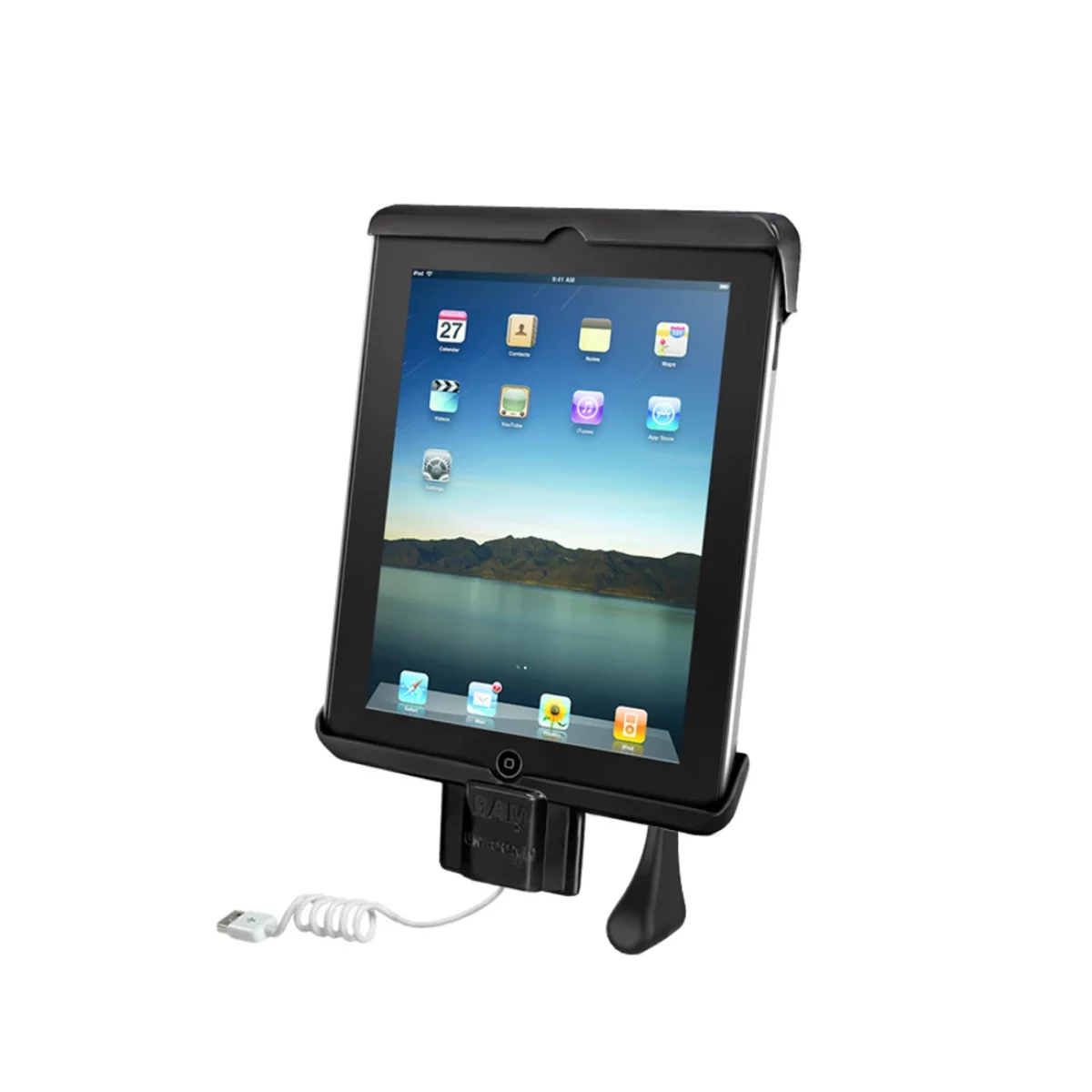 RAM products are renowned for their simple yet effective designs. The new RAM Tab-Lock™ with Uni-Conn™ for the Apple iPad, iPad 2 and iPad 3 is a perfect example of this. The RAM iPad locking dock features a unique patent pending design which enables the use of the factory iPad cables with docking connector for charging as well as other functions. Also works with most aftermarket cables and or modules with docking connectors. With the vast variety of available cable / docking connector accessories for the iPad you can quickly dock your iPad for charging, line out audio, external GPS antenna and much more. Spring loaded and equipped with a keyed lock, this compact yet durable holder won’t take up a lot of space yet provides loads of security. With the new Tab-Lock™ with Uni-Conn™, RAM lets you keep your tablet where it belongs…powered and in your possession.