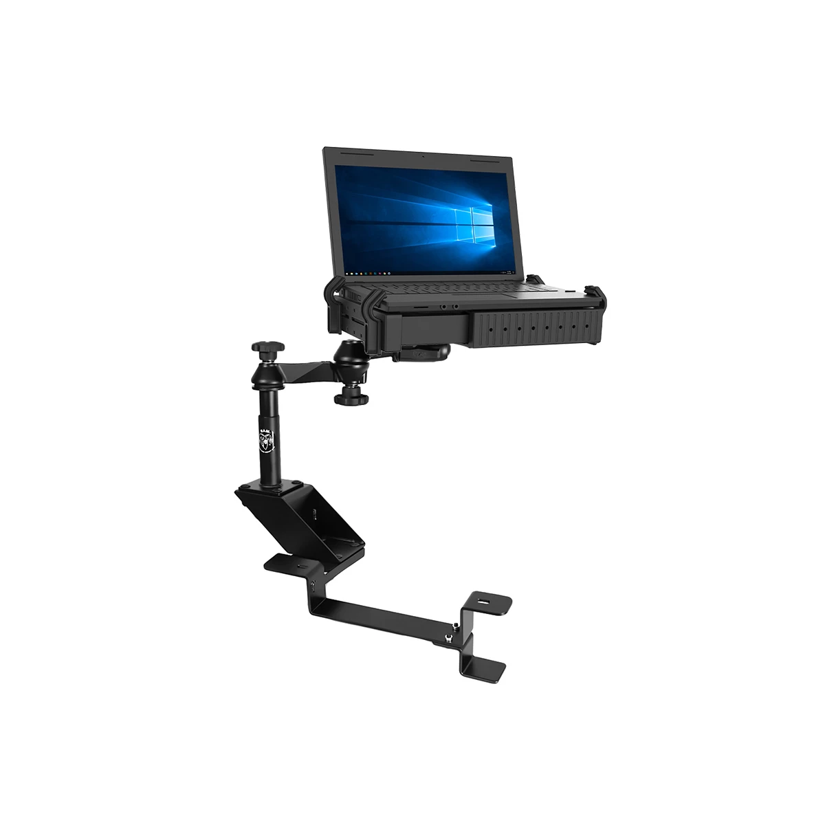 This No-Drill™ Laptop Stand System installs quickly and easily into the specified vehicles using the existing hardware of the passenger side seat rails. This configuration provides a telescoping feature that ranges from 9 to 13 inches which includes the fixed 4 inch riser. Dual swing arms provide articulation and 12 inches of reach for passenger and driver access to the mounted device. Patented rubber ball and socket joint provides additional adjustment as well as shock and vibration isolation. The RAM Tough-Tray™ is spring loaded to accommodate 10″ to 16″ wide laptops & (17″ wide screens). The tray features four adjustable retaining arms with rubber grip feature. These arms can be moved both vertically and horizontally. This allows for a custom fit for varying thicknesses of laptops and the freedom of not blocking ports or drives. A screen support and USB light are also available to accessorize the tray. Hole patterns on perimeter of tray facilitate the mounting of additional RAM systems to support GPS or other electronics.