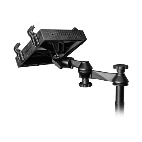 This No-Drill™ Laptop Stand System installs quickly and easily into the specified vehicles using the existing hardware of the passenger side seat rails. This configuration provides a telescoping feature that ranges from 12 to 18 inches. Dual swing arms provide articulation and 12 inches of reach for passenger and driver access to the mounted device. Patented rubber ball and socket joint provides additional adjustment as well as shock and vibration isolation. The RAM Tough-Tray™ is spring loaded to accommodate 10″ to 16″ wide laptops & (17″ wide screens). The tray features four adjustable retaining arms with rubber grip feature. These arms can be moved both vertically and horizontally. This allows for a custom fit for varying thicknesses of laptops and the freedom of not blocking ports or drives. A screen support and USB light are also available to accessorize the tray. Hole patterns on perimeter of tray facilitate the mounting of additional RAM systems to support GPS or other electronics.