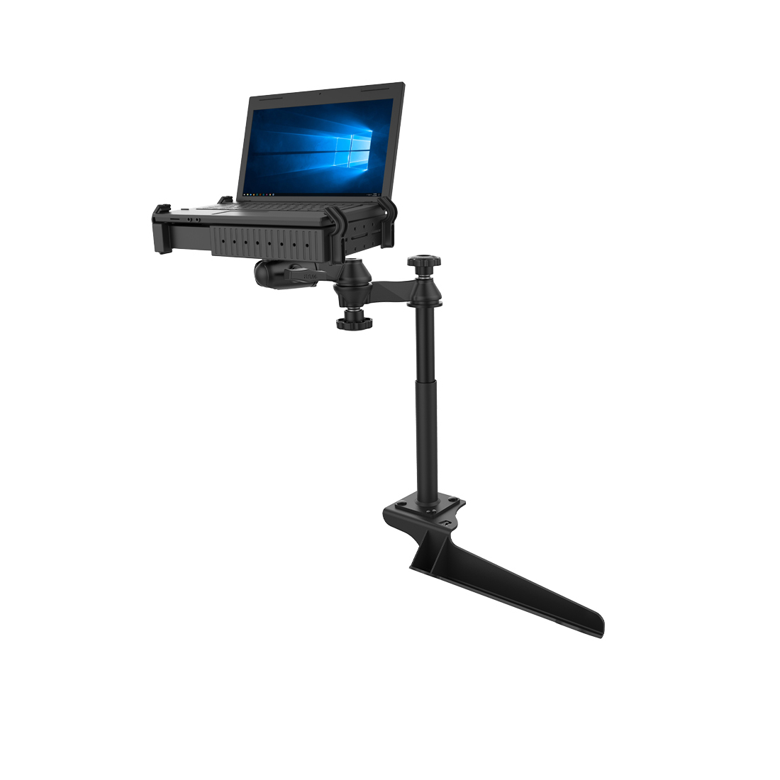 This No-Drill™ Laptop Stand System installs quickly and easily into the specified vehicles using the existing hardware of the passenger side seat rails. This configuration provides a telescoping feature that ranges from 12 to 18 inches. Dual swing arms provide articulation and 12 inches of reach for passenger and driver access to the mounted device. Patented rubber ball and socket joint provides additional adjustment as well as shock and vibration isolation. The RAM Tough-Tray™ is spring loaded to accommodate 10″ to 16″ wide laptops & (17″ wide screens). The tray features four adjustable retaining arms with rubber grip feature. These arms can be moved both vertically and horizontally. This allows for a custom fit for varying thicknesses of laptops and the freedom of not blocking ports or drives. A screen support and USB light are also available to accessorize the tray. Hole patterns on perimeter of tray facilitate the mounting of additional RAM systems to support GPS or other electronics.