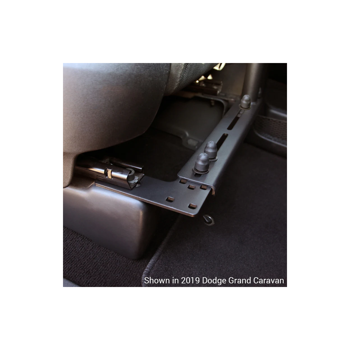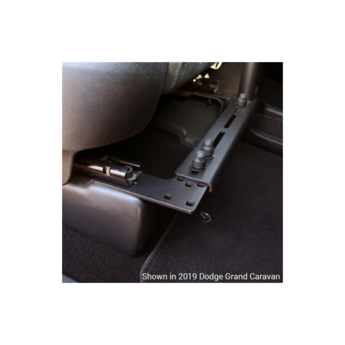 The RAM® Universal No-Drill™ Laptop features a heavy-duty steel mounting base designed to fit a variety of vehicles. Using the front bench or passenger side seat rail bolts as attachment points, existing hardware is used to secure the laptop mount base in the vehicle. The included RAM Tough-Tray™ is spring loaded to accommodate 10″ to 17″ laptops. The tray features four adjustable retaining arms with rubber grips. These arms can be moved both vertically and horizontally, enabling a custom fit for varying thicknesses of laptops and access to ports or drives. A screen support and USB light are also available to accessorize the tray. Hole patterns on perimeter of tray facilitate the mounting of additional RAM systems to support phones or other electronics.