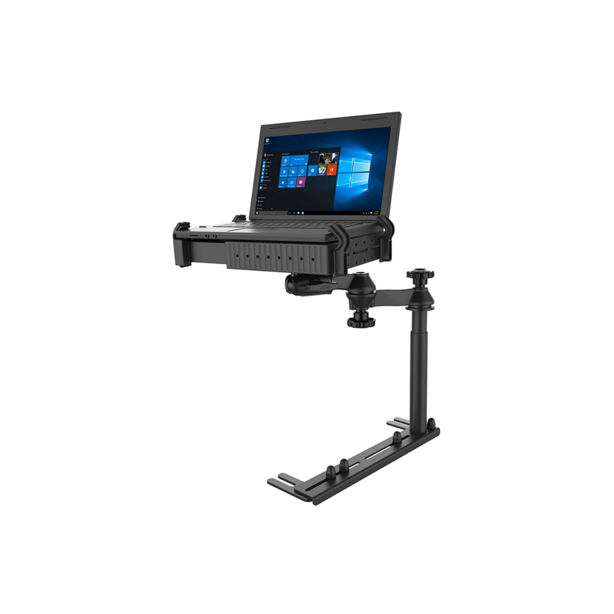 The RAM® Universal No-Drill™ Laptop features a heavy-duty steel mounting base designed to fit a variety of vehicles. Using the front bench or passenger side seat rail bolts as attachment points, existing hardware is used to secure the laptop mount base in the vehicle. The included RAM Tough-Tray™ is spring loaded to accommodate 10″ to 17″ laptops. The tray features four adjustable retaining arms with rubber grips. These arms can be moved both vertically and horizontally, enabling a custom fit for varying thicknesses of laptops and access to ports or drives. A screen support and USB light are also available to accessorize the tray. Hole patterns on perimeter of tray facilitate the mounting of additional RAM systems to support phones or other electronics.