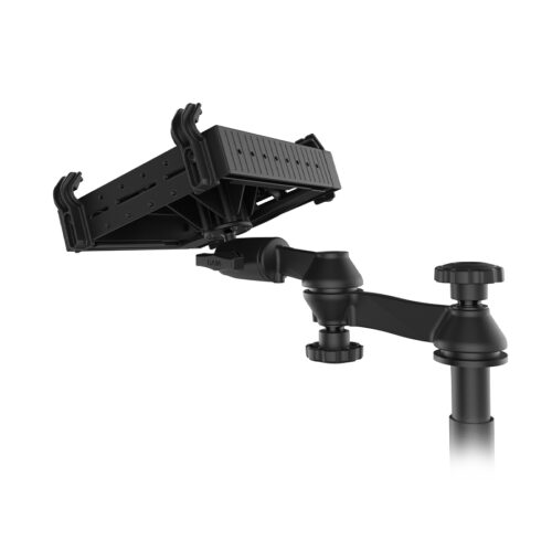 This universal drill-down laptop kit installs quickly and easily into most vehicles by using self tapping screws, or by drilling and then bolting down the mount base to the vehicle*. This configuration provides a telescoping feature that ranges from 12 to 18 inches. Dual swing arms provide articulation and 12 inches of reach for passenger and driver access to the mounted device. Patented rubber ball and socket joint provides additional adjustment as well as shock and vibration isolation. The RAM Tough-Tray™ is spring loaded to accommodate 10″ to 16″ wide laptops & (17″ wide screens). The tray features four adjustable retaining arms with rubber grip feature. These arms can be moved both vertically and horizontally. This allows for a custom fit for varying thicknesses of laptops and the freedom of not blocking ports or drives. A screen support and USB light are also available to accessorize the tray.