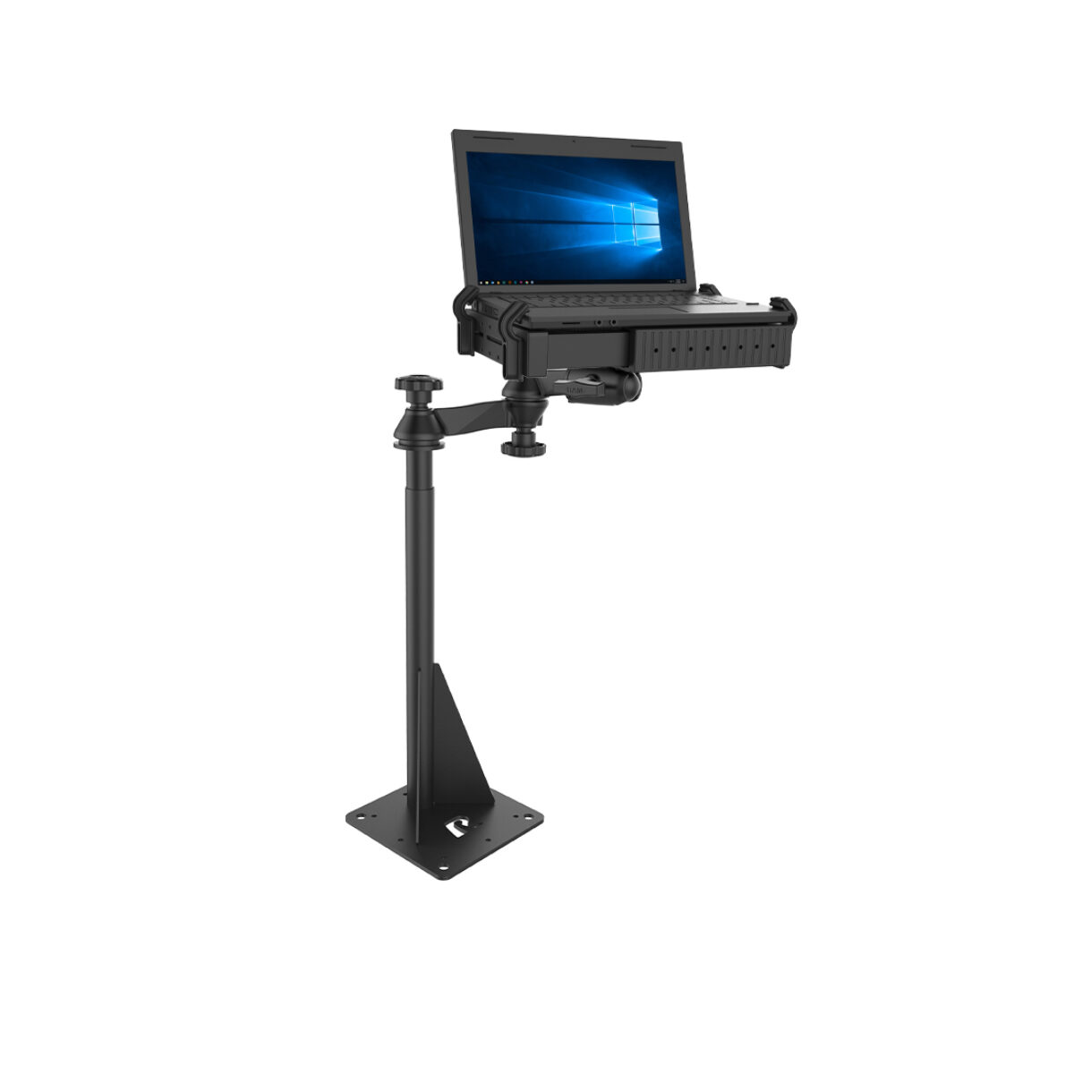 This universal drill-down laptop kit installs quickly and easily into most vehicles by using self tapping screws, or by drilling and then bolting down the mount base to the vehicle*. This configuration provides a telescoping feature that ranges from 12 to 18 inches. Dual swing arms provide articulation and 12 inches of reach for passenger and driver access to the mounted device. Patented rubber ball and socket joint provides additional adjustment as well as shock and vibration isolation. The RAM Tough-Tray™ is spring loaded to accommodate 10″ to 16″ wide laptops & (17″ wide screens). The tray features four adjustable retaining arms with rubber grip feature. These arms can be moved both vertically and horizontally. This allows for a custom fit for varying thicknesses of laptops and the freedom of not blocking ports or drives. A screen support and USB light are also available to accessorize the tray.