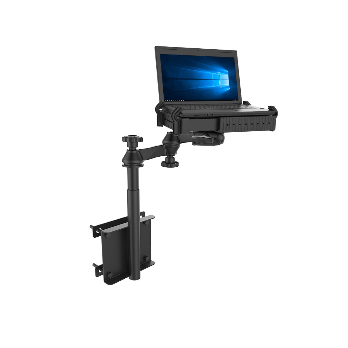 This universal drill type Laptop Stand System installs quickly and easily into most vehicles by using self tapping screws, or by drilling and then bolting down the mount base to the vehicle*. This configuration provides a telescoping feature that ranges from 12 to 18 inches. Dual swing arms provide articulation and 12 inches of reach for passenger and driver access to the mounted device. Patented rubber ball and socket joint provides additional adjustment as well as shock and vibration isolation. The RAM Tough-Tray™ is spring loaded to accommodate 10″ to 16″ wide laptops & (17″ wide screens). The tray features four adjustable retaining arms with rubber grip feature. These arms can be moved both vertically and horizontally. This allows for a custom fit for varying thicknesses of laptops and the freedom of not blocking ports or drives. A screen support and USB light are also available to accessorize the tray.