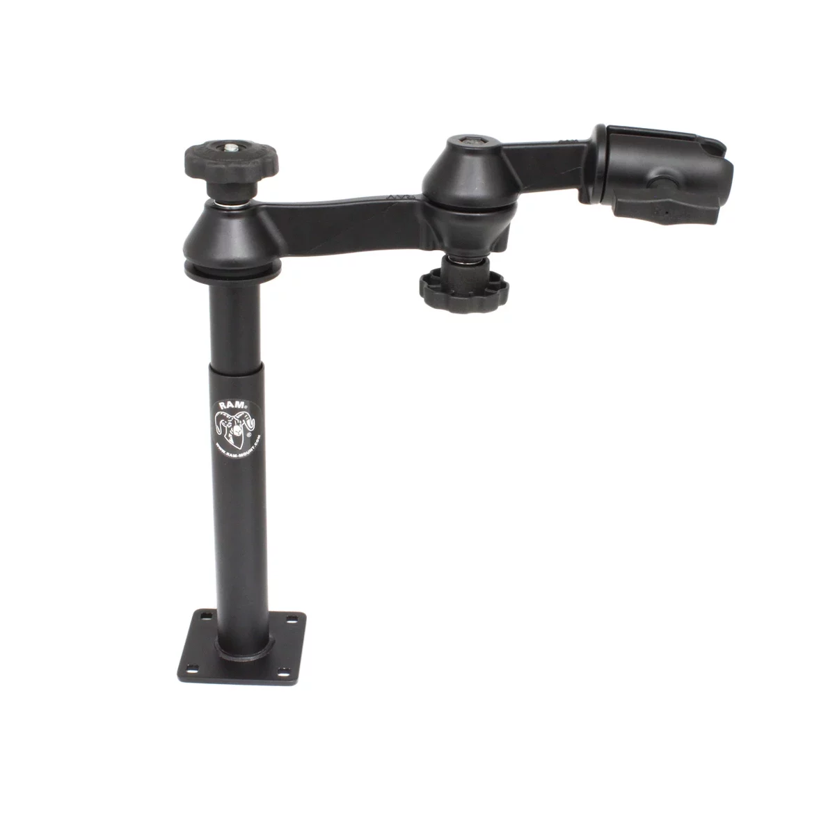 The RAM RAM-VP-SW1-89NB, combination swing arm/tele-pole™ system, will connect to any RAM vehicle base without a welded female tele-pole™. Included is a tele-pole™ with a height range from 11.5″ to 17″; it can be easily adjusted by turning the knob at the top of the post.